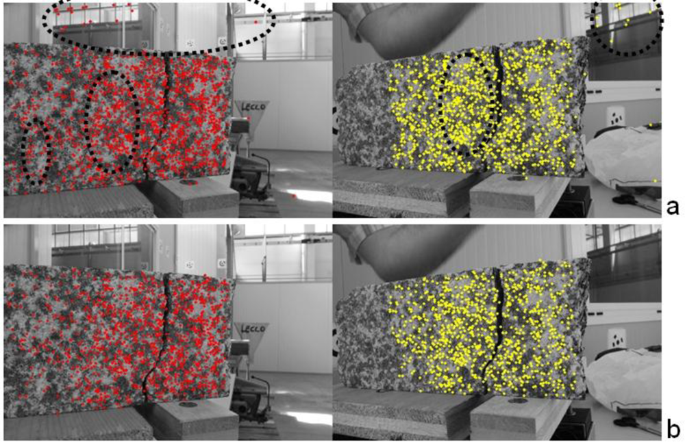 After all these steps outliers can be removed and a final LSM refining is carried out to improve the precision of image coordinates. Figure 9 shows the application of the procedure. Two synchronized Nikon D80s with 20 mm lenses were placed in front of a micrometric sledge. Two pieces of rocks, which simulate a real construction element, were leant on the plates of the sledge and several shifts were given in order to compare the image measurements with the mechanical ones. The results of the matching with the descriptors are shown in Figure 9a, in which several outliers can be seen. After the robust estimation of the fundamental matrix, all these mismatches were correctly removed (Figure 9b) and can be refined via LSM by fixing each point in the first image and searching the homologous in the second one. Lastly, a free-net bundle adjustment was carried out and the scale of the reconstruction was fixed with a small calibrated bar. Finally, a tracking process based on cross-correlation and LSM is carried out along the image sequence and 3D points are estimated with a simple intersection by using the computed orientation parameters.