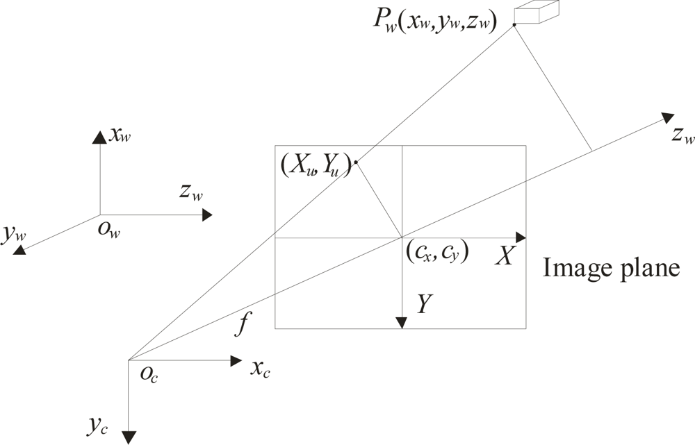 In lighting methods calibration is performed based on perspective projection [6–24]. This procedure is carried out by means of calibrated references and a transformation matrix. Typically, the perspective projection model is determined based in the geometry shown in Figure 1. In this geometry, a point Pw = (xw, yw, zw) is transformed to the camera coordinates Pc = (xc, yc, zc) by Pc = R·Pw + t. Where R is the rotation matrix and t is the translation vector. Here, the transformation Pc to the image coordinates (Xu, Yu) is given by Xu = fxc/zc and Yu = fyc/zc Considering radial distortion, the image coordinates are represented by Xd + Dx = Xu and Yd + Dy = Yu, where Dx = Xd (δ1r2 + δ2r4 + …), Dy = Yd (δ1r2 + δ2r4 + …) and r = (Xd2 + Yd2)1/2. In these expressions, Xd and Yd are the distorted coordinates. The pixel coordinates are also converted into real coordinates by means of a scaling factor η. Thus, the parameters to be calibrated are the matrix R, the vector t, the focal length f, the distortion coefficient δi, the image center (cx, cy) and the scaling factor η. This procedure is carried out by detecting calibrated references on a reference plane and use of a transformation matrix [6–27]. Then, the calibration data are passed to the vision system to perform three-dimensional visualization.