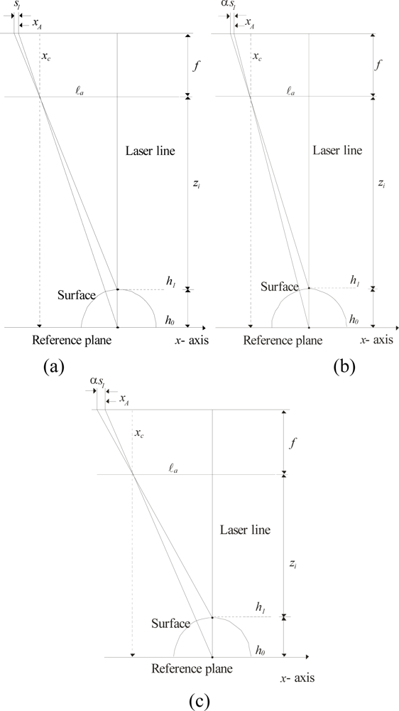 (a) Initial geometric configuration. (b) Geometry of the camera moved toward the laser line in x-axis. (c) Geometry of the camera moved toward the object surface in z-axis.