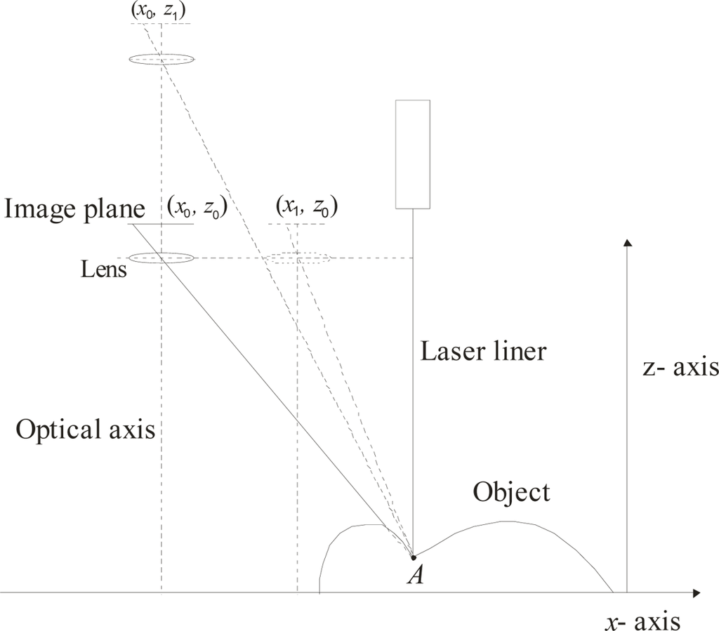The contribution of the mobile calibration when an occlusion appears during the vision task was also studied. Typically, occlusions appear due to the surface variation and a big distance ℓa. This criterion is studied based on the geometry shown in Figure 11, in which the point A is occluded at the initial configuration when the image plane is placed at (x0, z0). Here, an occlusion is detected when the width of the line is less than three pixels.