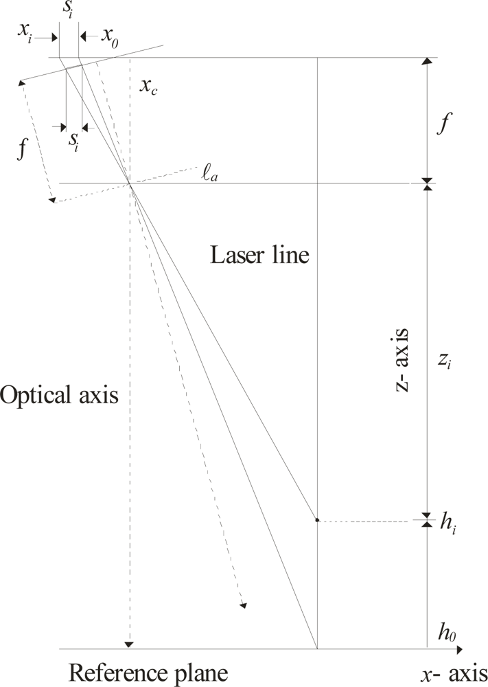 In Equation (5) f, xc, and xA are constants. In this case, a linear hi produces a linear si. Conversely, a linear si produces a linear ki. Therefore dk/ds, the derivative of ki with respect to si, is a constant. Another camera orientation is an optical axis not perpendicular to the reference plane. In this case, a linear si does not produce a linear ki and the derivative dk/ds is not a constant.