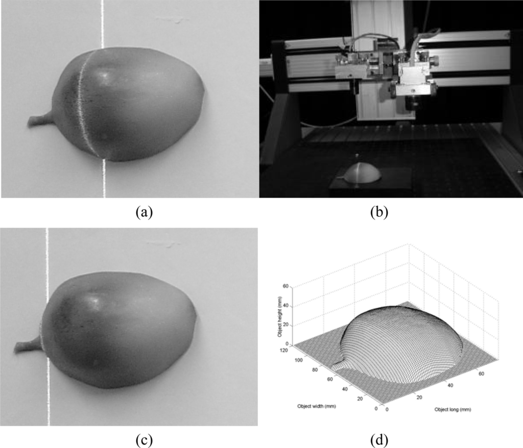 The first test of the mobile calibration is the three-dimensional visualization of a plastic fruit, shown in Figure 13(a). To carry this out, the fruit is scanned by the vision system as shown in Figure 13(b). In this procedure, a set of images is captured by the CCD camera. From each image, the line shift si is detected via Equation (1) and converted to a value u via Equation (7). In addition, the coordinate yi of the laser line is converted to a value v via Equation (8). Then, the network computes a transverse section of the object by substituting the values (u,v) in Equation (10). In this scanning, an occlusion is detected by the broken line shown in Figure 13(c). To avoid the occlusion, the camera is moved toward the laser line. In doing so, the initial geometry has been modified, so the line shift should be re-calibrated online based on the factor α via Equation (24). To carry this out, the line position αXj is detected in each row of the images in the y-axis. In this case, the term αXj is the line position and the j-index is the row number of the image in the y-axis. Here, the position αXA is the smaller distance from the term (αXj−xc). Then, the factor α is computed and the line shift is divided by this factor to achieve the online re-calibration and the re-calibrated shift si is substituted in the network Equation (10) to compute the surface hi. The whole surface is reconstructed from all depth data provided by the network. Fifty six images were processed to obtain the plastic fruit shown in Figure 13(d), where the scale of this figure is in mm.