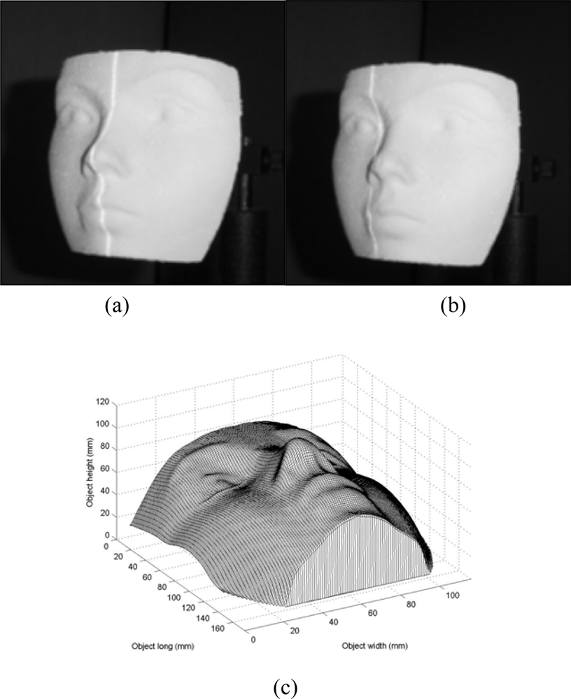 The second test of the mobile calibration is the vision of a dummy face shown in Figure 14(a). To carry this out, the dummy face is scanned by the vision system. In this scanning, no reference plane exists. This was established based on the absence of a line at the end and beginning of the image in the y-axis. Here, the shifting magnitude is different from the initial configuration, so the line shift should be re-calibrated online. In this case, the line position αXj is detected in each row of the image in the y-axis. From these line positions, the position αXA is determined as the minimum distance from the term (αXj − xc). Then, the factor α is computed via Equation (24) and the line shift is divided by this factor α to achieve the online re-calibration and the re-calibrated shift si is converted to a value u. In addtion, the coordinate yi of the laser line is converted to a value v. Then, the network computes the data hi of a transverse section of the object by substituting the values (u,v) in Equation (10).