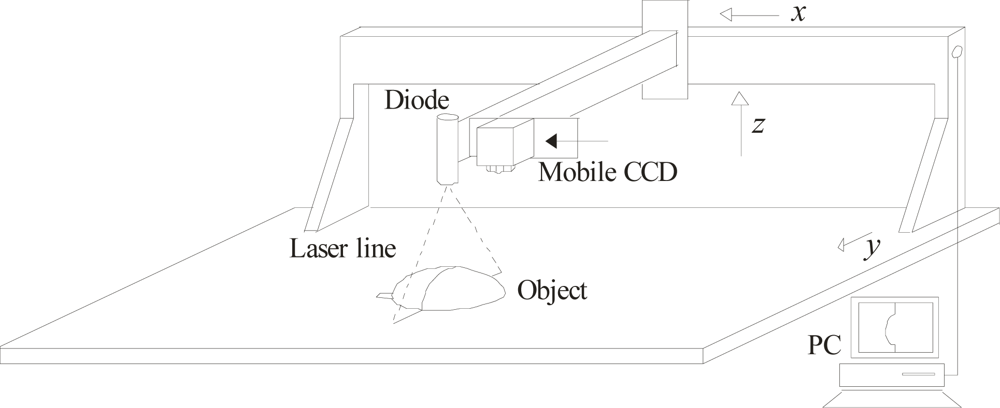 In the proposed mobile calibration, a Bezier network provides the data to perform the online re-calibration and three-dimensional visualization based on a mobile setup and image processing of a laser line. The mobile setup to perform the three-dimensional vision is shown in Figure 2. This arrangement includes an electromechanical device, a CCD camera, a laser line projector and a computer to process the data. In this setup, the laser line is projected perpendicularly on the surface and the CCD image plane is aligned parallel to the reference plane. In this geometry, the laser line reflected to the CCD camera forms an angle that varies according to the position of the reference plane in the z-axis. The orientation of the CCD camera and the laser line orientation are fixed. The alignment of the camera and laser line are described in Section 3. The electromechanical device moves the laser and the camera in the x-axis, y-axis and z-axis. In addition the camera can also be moved toward the laser diode along in the x-axis.