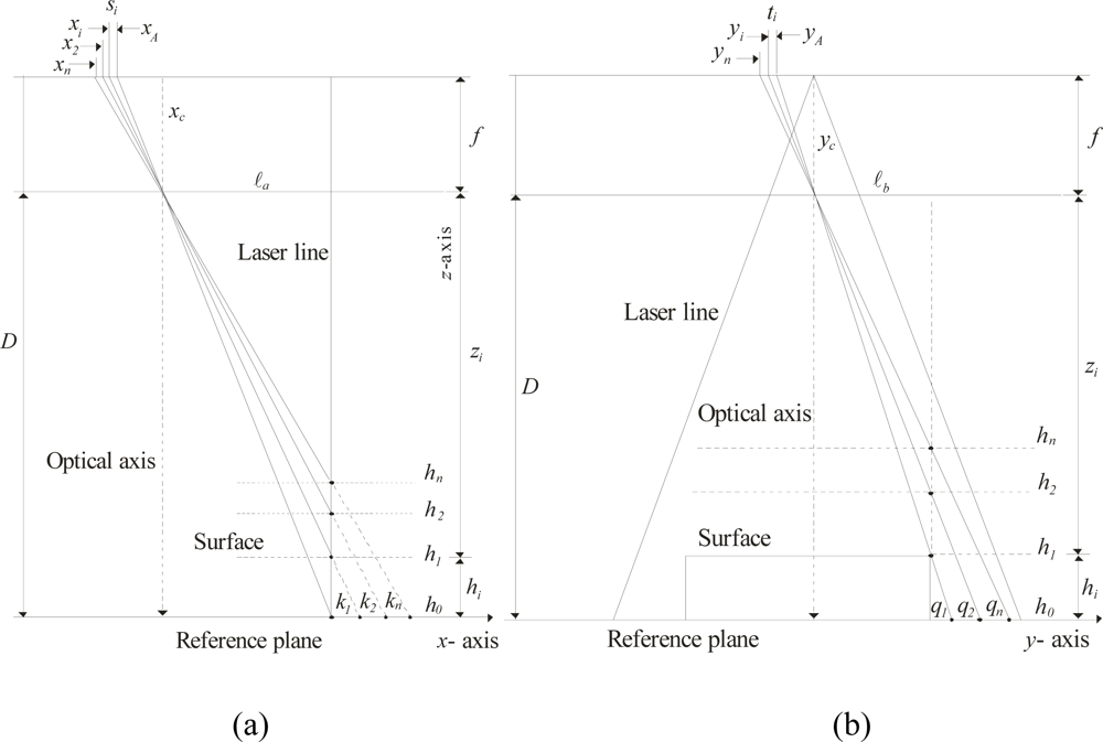 The camera orientation along the y-axis is performed based on the geometry of Figure 3(b). In this geometry, a line pattern is moved in steps yi in the image plane in the y-axis based on depth hi. In this geometry, the optical axis is perpendicular to the reference plane and the term (qi/hi) = [ℓb/(D − hi)] = [η (yc − yi)/η f] is obtained. Here, the position of the pattern shifting is computed by ti = (y0 − yi) = (yc − yi) − (yc − yA). Thus, the following expression is obtained: