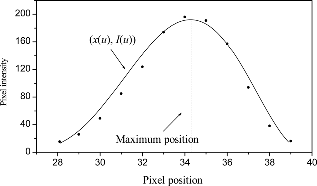 To compute the shift, the line position xA and xi are detected in the image. To carry this out, the intensity maximum is measured in each row of the image. Then, first and second derivatives are computed to obtain the maximum. To detect the maximum, the pixels are approximated to a continuous function by means of Bezier curves [28]. In this case, the pixels are represented by (x0, I0), (x1, I1),......, (xn, In), where xi is the pixel position, Ii is the pixel intensity and n is the pixel number. The Bezier curves are described by: