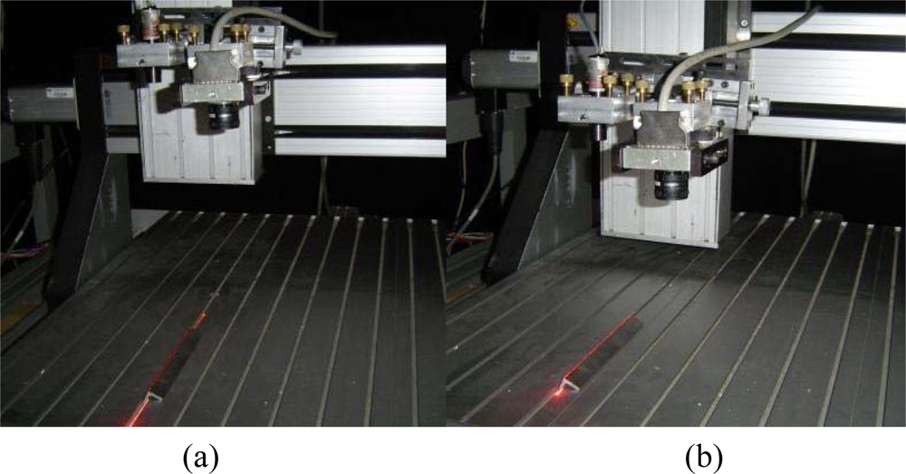 (a) Laser line on the reference plane. (b) Laser line at 25.4 mm from the reference plane.