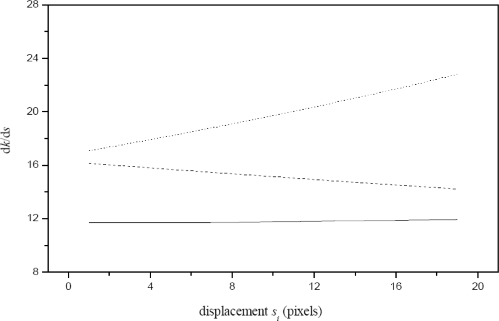 In Equation (6) f, yc and yA are constant. In this case, a linear hi produces a linear ti. A linear ti also produces a linear qi, so the derivative dq/dt is a constant. In this manner, the camera orientation is defined by the dk/ds = constant and dq/dt = constant. Due to the distortion, these derivatives are not exactly a constant, but they may be considered constant. For the camera orientation in the x-axis, the reference plane is moved from h0 to h1, h2, h3,…, hn by means of the electromechanical device. For each depth hi, the line position xi is computed by the procedure described in Section 2. Then, the shifting si is computed via Equation (1), the derivative dk/ds is computed and it is evaluated with respect to the derivative dk1/ds. If dk/ds is bigger than dk1/ds the camera is rotated to the right in steps of 0.0896 degree. Again, the reference plane is moved from h0 to h1, h2, h3,…, hn and the derivative is computed. If dk/ds is less than dk1/ds the camera is moved in the opposite direction. The rotation to the left and right is repeated until the minimum error of derivative dk/ds respect to dk1/ds is found. In this case, the derivative dk/ds is not exactly a constant, but it is close to constant. This criterion is illustrated by the derivative shown by the solid line in Figure 6, where the dashed line represents dk/ds of an optical axis aligned at an angle smaller than 90°. The dotted line is dk/ds of an optical axis aligned at an angle greater han 90°.