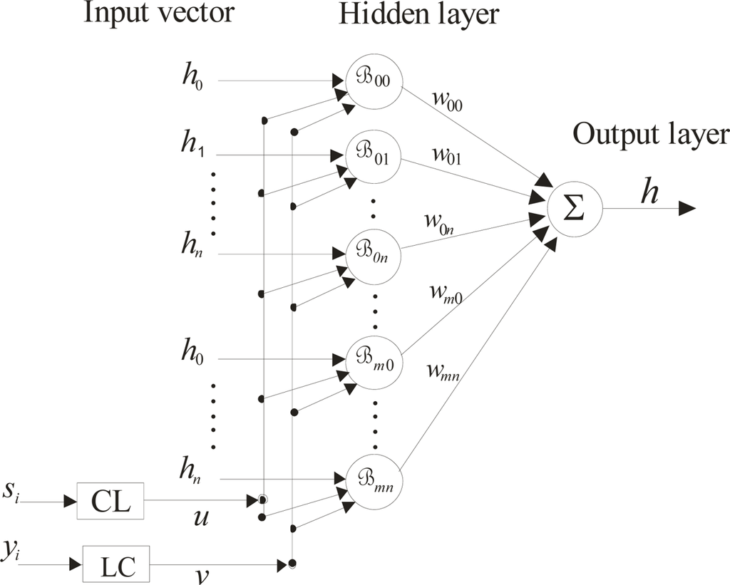 where b0 and b1 are constants to be determined. Using two values yi and its respective v, Equation (8) is determined. Bezier curves are defined in the interval 0 ≤ v ≤ 1. In this case, v = 0 for y0 and v = 1 for yn. Substituting these two values in Equation (8), two equations with two unknown constants are obtained. Solving these equations, b0 and b1 are determined. Thus, for each coordinate yi, a value v is computed via Equation (8). The hidden layer is built by a Bezier basis function, which is described by: