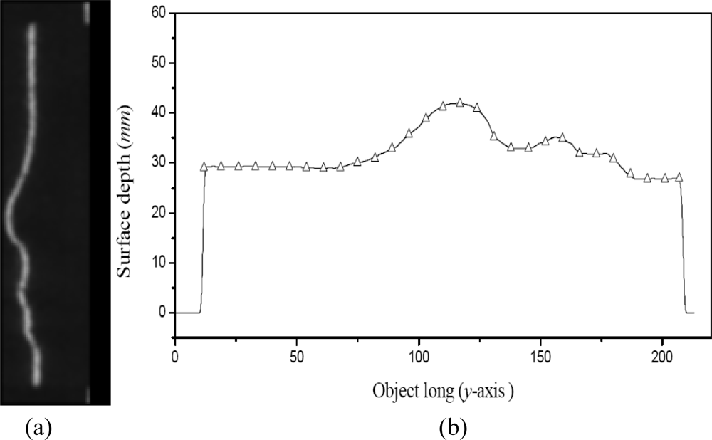 (a) Laser line projected on a surface. (b) Surface depth computed by the network form the laser line.