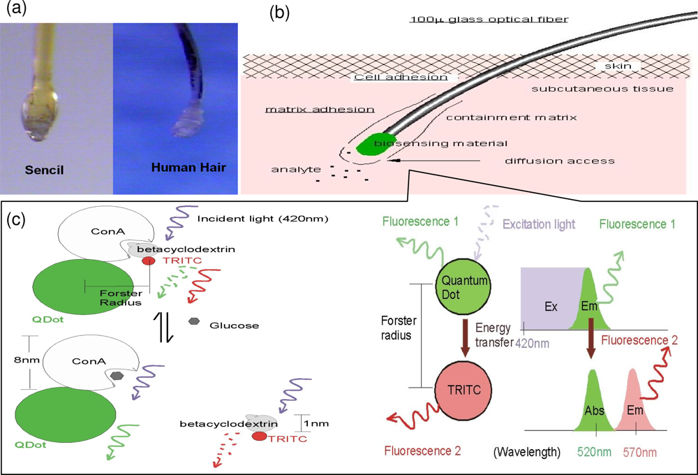 Illustration of the Sencil™ system for glucose sensing. (a) Similarity of shape and size between Sencil™ and human hair with attached follicle (white bar = 100 μm). (b) Sensor components and relationships to tissue in vivo. (c) Changes in FRET between fluorophores covalently immobilized on the flexible PEG matrix depend on changes in the distance between them, which in turn depends on the competitive natural affinity between Con A and various saccharides such as betacyclodextrin and glucose. The figure is modified with permission from [10], published by Biosensors Bioelectronics, 2008.