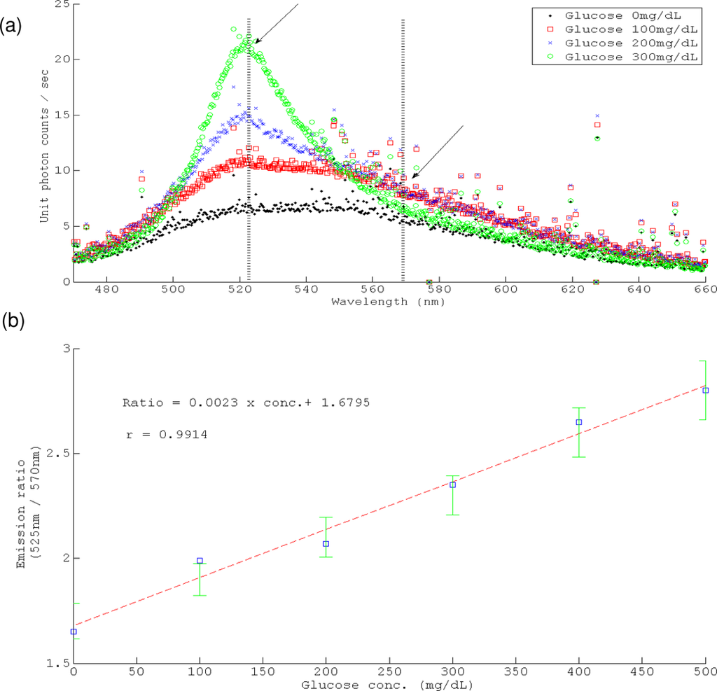 Sensor calibration from the linear fitting result of in vitro measurements. (a) Absolute emissions at 525 nm and 570 nm (arrows) were applied to calculate the ratio for indicating glucose concentration. (b) Linear correlation between the emission ratios and the corresponding glucose concentrations. The standard deviations (from the six sensors manufactured in the same batch) of the calibration values at corresponding glucose concentrations are shown as green error bars.