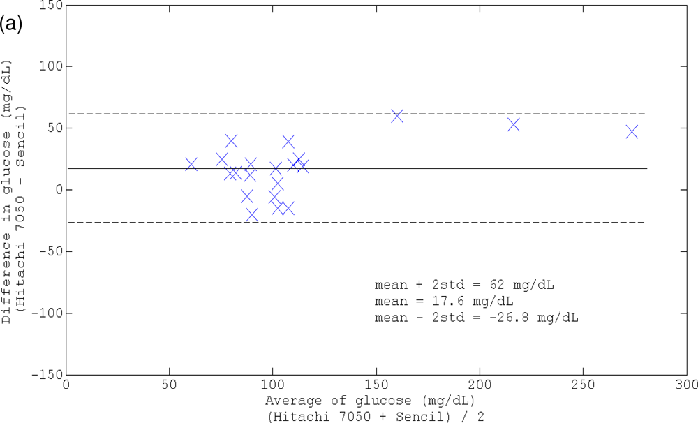 Accuracy of agreement between Sencil reading and plasma reference: (a) Bland-Altman method analysis; (b) least square linear fitting result; (c) Clarke error grid analysis.