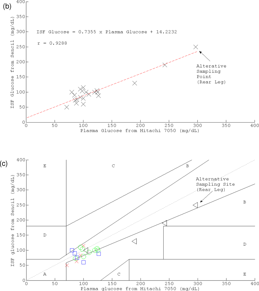 Four dogs, three mixed-breed and one Golden Retriever were included in this research. The mean body weight was 20 kg (from 13 to 32 kg). All subjects underwent standard ovariohysterectomy in the abdomen region and anesthesia for 125 to 186 minutes. The venous blood samples were drawn (1 mL) from the foreleg (specified in Figure 2) in the interval of 13 to 56 minutes without interfering with the progress of the surgery. A total of 21 pairs of ISF readings from Sencil™ and plasma glucose reference from the Hitachi 7050 instument were collected for analysis.