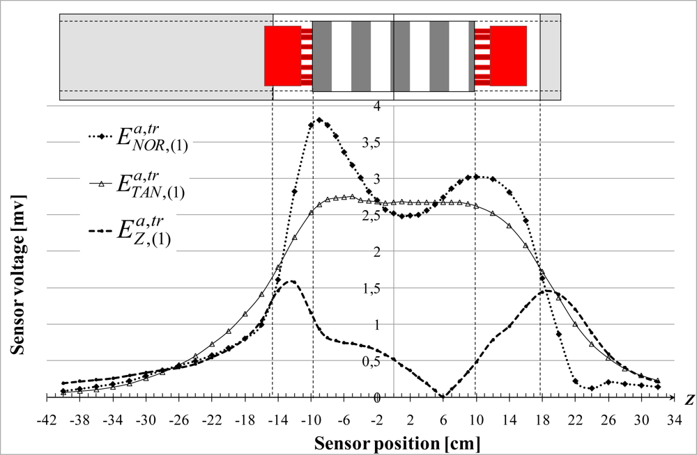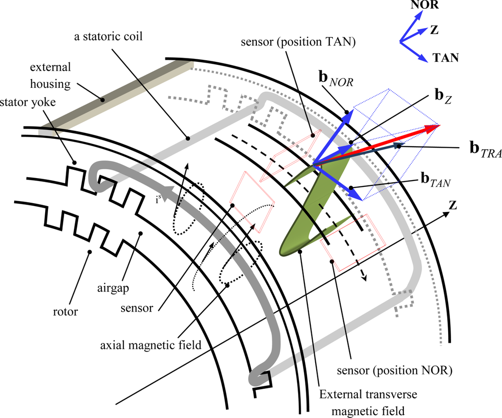 The external magnetic field radiated by a 3-phase p pole pair machine can be characterized by two components: a bz axial component oriented along the motor axis Z and a bTRA transverse component as shown in Figure 1. The transverse component has, if a cylindrical frame is considered, 2 projections: a bNOR normal component and a bTAN tangential component respectively oriented with the axes NOR and TAN [].