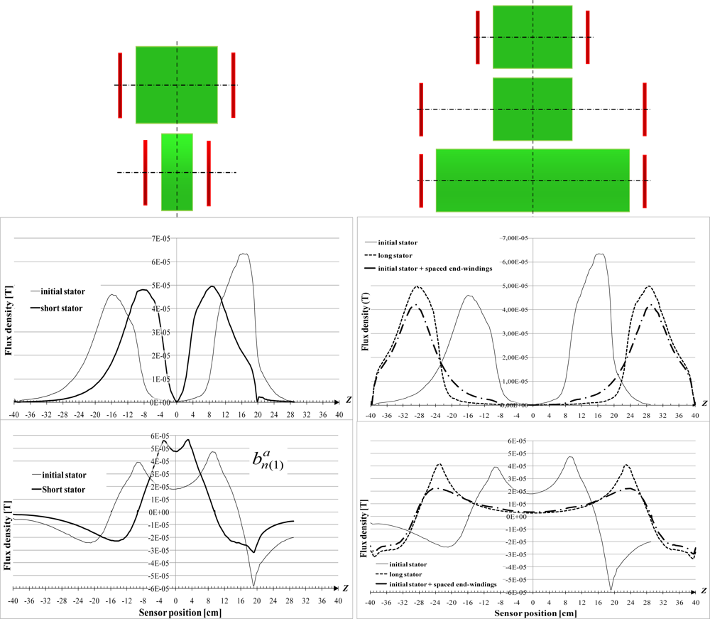 The eddy currents in the yoke and the saturation are first neglected. Figure 11 shows that the field calculated outside the motor has the same variations as found experimentally. Then, cases of long and short stators are also highlighted as well as the case of end-windings far from the magnetic circuit. For those simulations, both the stator and rotor magnetic circuits are changed and the yoke and flanges are modified to be still well adapted.