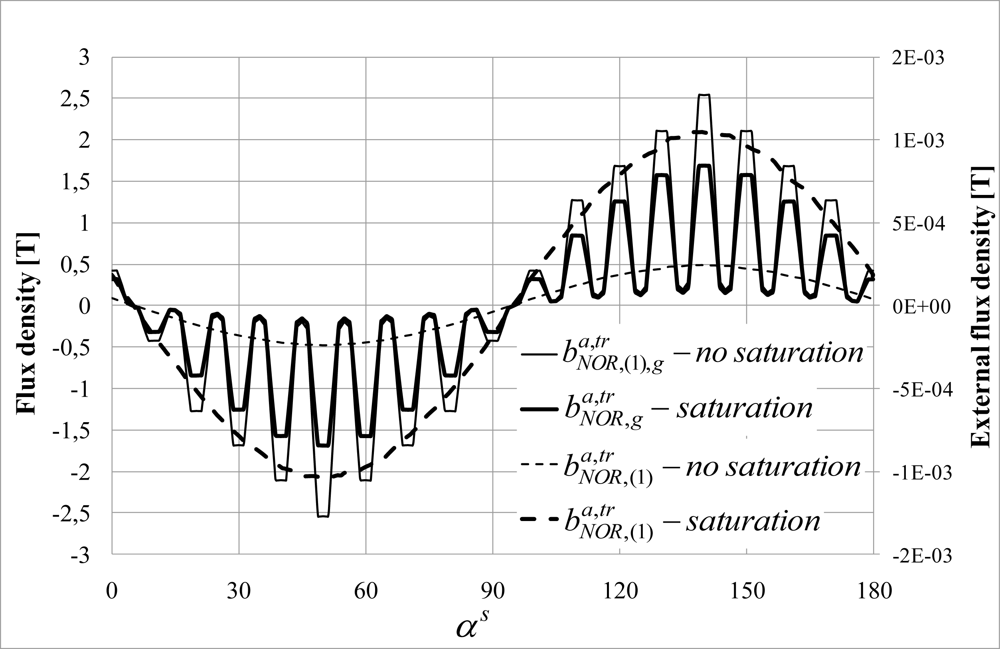 fundamental normal flux density component outside the machine is 4.47 times higher when saturation is taken into account. Variations of the tangential and normal components have the same waveforms when the saturation is taken into account; only their amplitudes are modified.