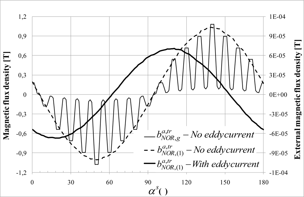 normal external flux density component obtained numerically with Opera 3D. In the simulation, the yoke conductivity is 106 S/m. It shows that the eddy currents are responsible on a decrease of 33% and a phase difference of 30°. The same phenomenon (mitigation and shifting) has been observed for the tangential component.