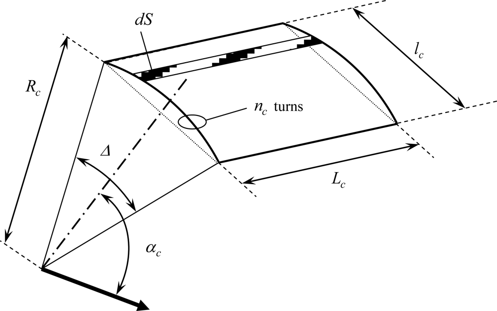 Let us consider a sensor made of a rectangular coil of Lc length and lc width, placed against the motor yoke (position NOR) at a Rc distance from the motor axis, as shown in Figure 3. Lc is small relatively to the machine effective length so that the field in Z direction can be considered as uniform. Δ and αc are respectively the angular sensor opening and the position of the sensor axis compared with the phase 1 axis. (we neglect for this demonstration phase shifts introduced by the magnetic circuit and the yoke). Because of the sensor dimensions, lc ≈ RcΔ even if the sensor is flat.