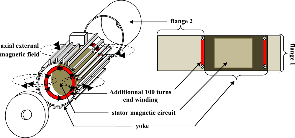 The major difficulty when external flux is measured is to separate the influence of the currents flowing in the end-winding connections from the effect of the air gap field. Simplified approaches assimilate the end windings field to the current flowing in the coils and the transverse field to the air gap field. Nevertheless, the phenomena are more complex. Indeed, the transmission of the field from the air gap to the outside of the motor requires the crossing of the sheet stack and then the yoke. Previous studies [–] show that the yoke is responsible for a major mitigation. As it is made of one piece, contrary to the laminated stator magnetic circuit, eddy currents flow in the yoke, creating a magnetic field, which the effects are opposed to the main field (Figure 2). As a consequence, the external field is attenuated and phase-shifted. It will be shown that those effects are dependent on both the machine load state and the magnetic circuit saturation, making the study a little more delicate.