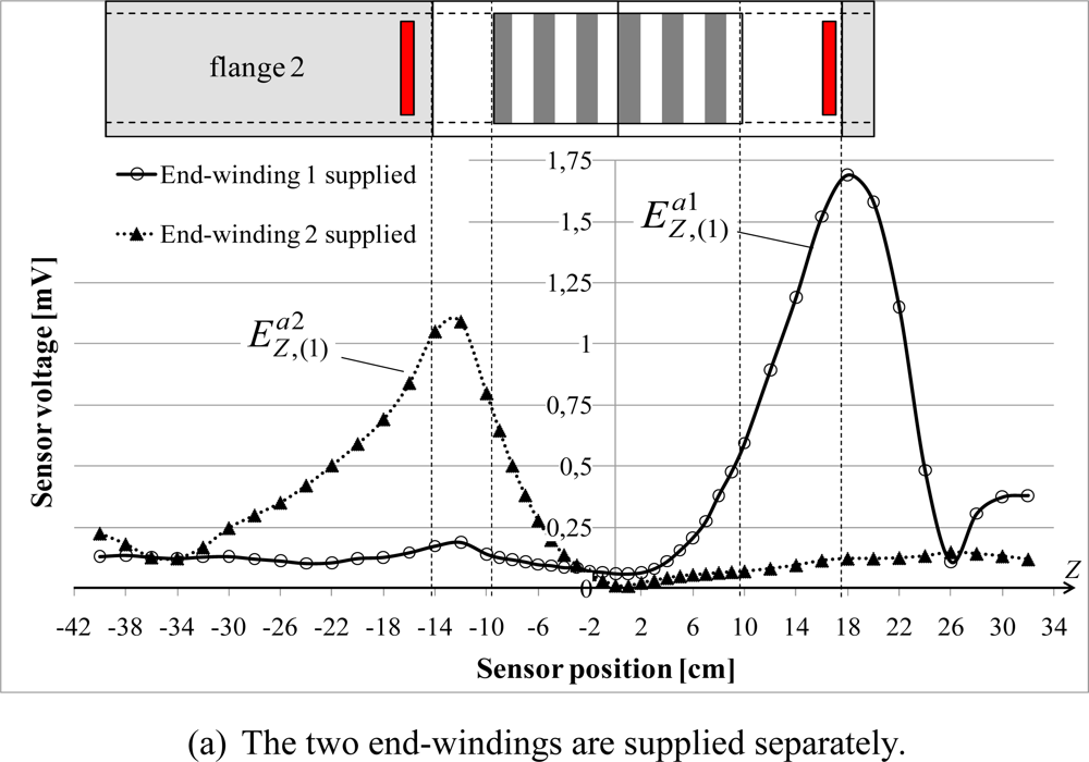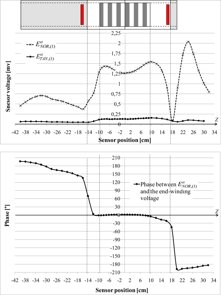 fundamental components measured by the sensor when the artificial end-windings are series connected. For the two measurements, the sensor is placed against the yoke. The