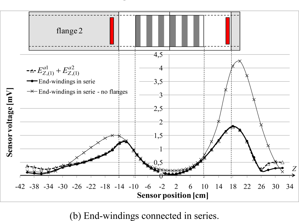 - - When connected in series, the coils generate a field so that is measured. The Figure 7b also shows the sum of and obtained with and without the flanges.