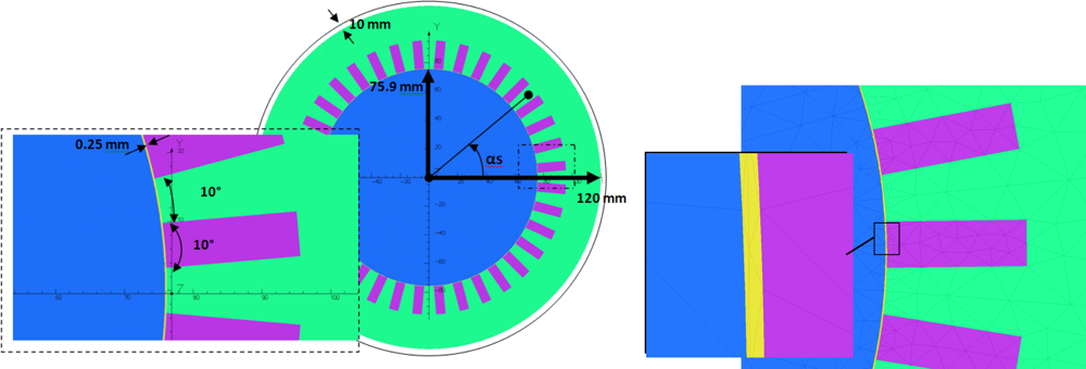 The motor used for the tests was simulated with the finite element software Opera 3D. Figure 9 shows both the model and meshing. The simulation can take into account the permeability of the iron and the yoke. The simulation conditions are the same as for the previous experiment: the rotor is static and its winding is not short-circuited,additional end-windings are added (Figure 10).