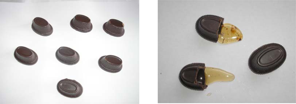 Chocolate products share consumers' preferences with other confectionery products, especially due to their chemical and physical properties perceived by consumers as unique sensory attributes. Molded chocolates such as pralines are quite popular and can contain a center filled with fruits, creams, liquors, etc. These combinations have a significant effect on the products' texture and taste, and thus on its acceptability. Ziegleder et al. [8] analysed factors that effect the quality and stability of pralines with nougat filling and filling obtained with milk fat and fractionated palm-seed oil, during their storage for up to 500 days at 5–23 °C, while Rohm et al. [9] published their results concerning the application of the so-called one-shot praline production technique, with the simultaneous dosing of the filling, and of chocolate.