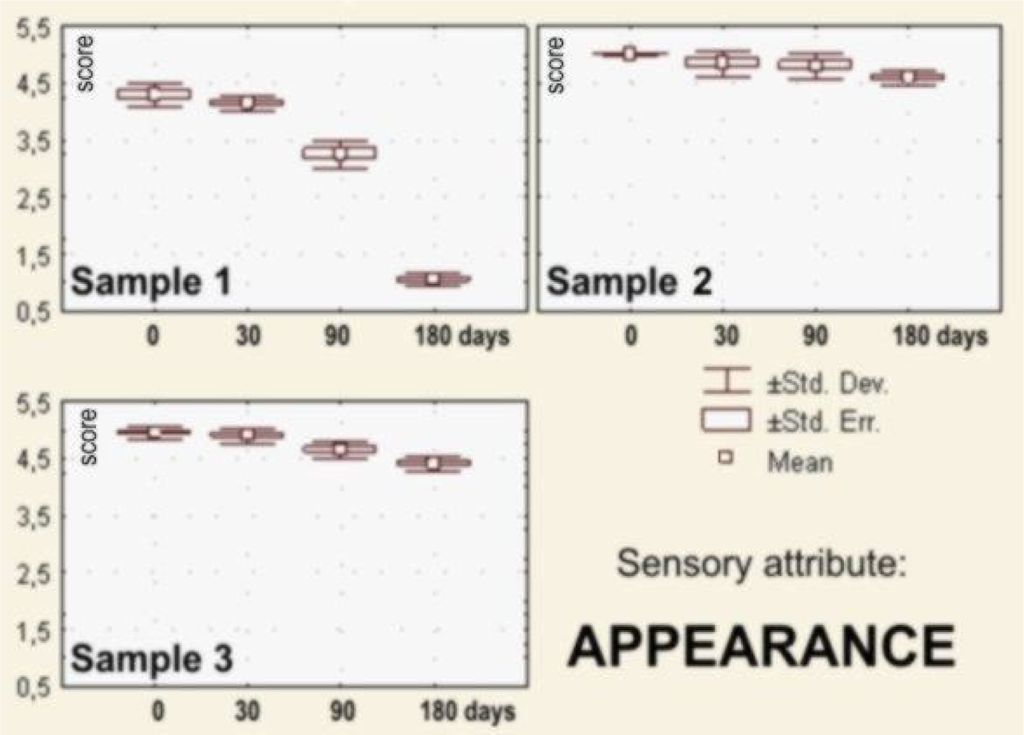 When considering the composition of pralines (kind of filling), it is seen that between the pralines filled with the blossom honey and those filled with the combination of blossom honey and pollen there is no statistically significant difference. On the other hand, there is statistically a very significant difference with respect to the appearance (p < 0.01) between pralines with the mentioned fillings (samples 2 and 3) and those filled with melliferous bee drone larvae. Like the attribute of appearance, the sensory attribute of texture (structure) and of the chewiness for the analyzed samples does not statistically change significantly for up to 30 days of storage, but, after that period of until the end of the experiments a statistically very significant change of that attribute appears. With respect to the composition (kind of filling), there appear to be very statistically significant differences present (p < 0,01) for the attribute of chewiness between all analyzed samples of pralines (samples 1, 2 and 3).