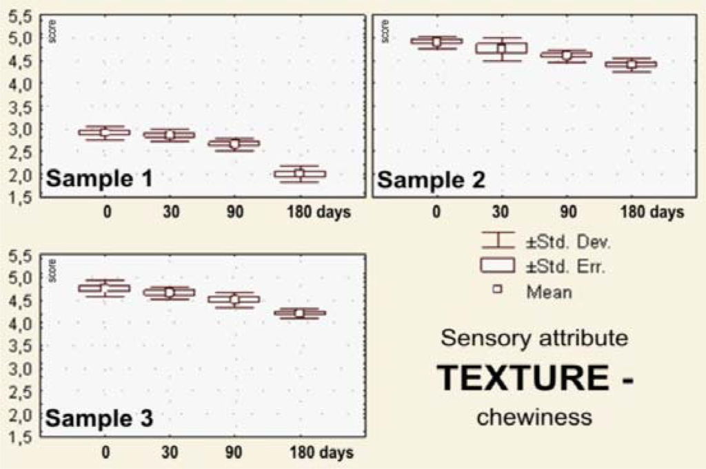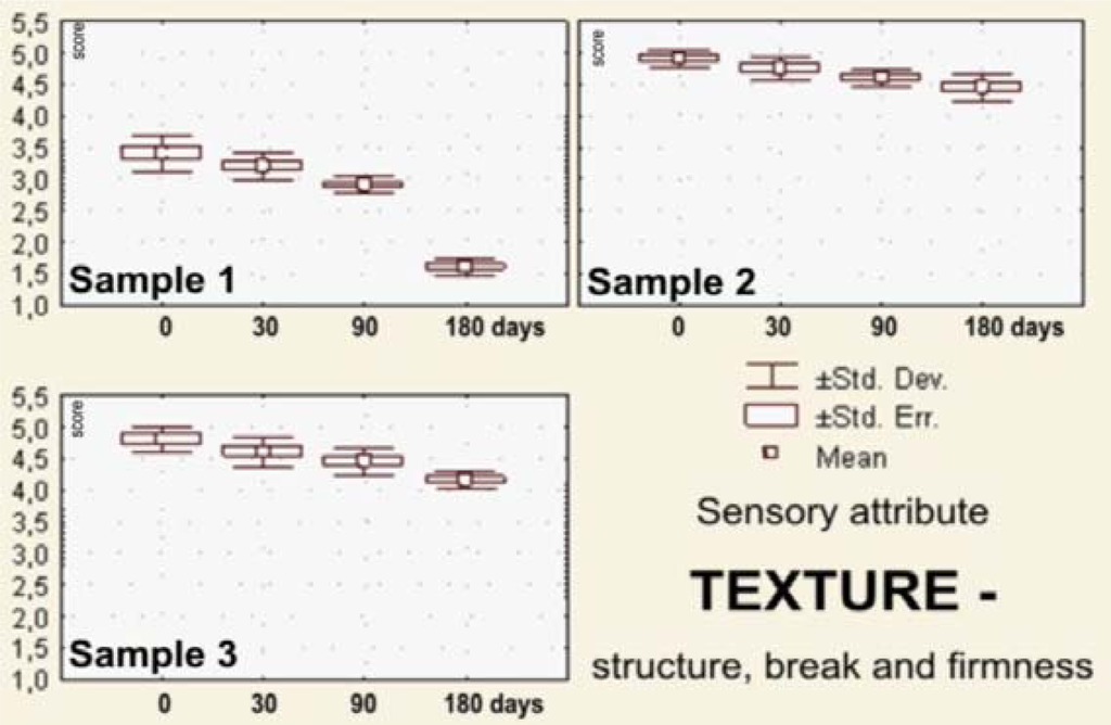 Chocolate has a unique taste, aroma and texture, because of which it represent a favorite dessert for a great number of people. During its consumption, it melts at the temperature of the human body. In the mouth, the firm structure transforms into a thick suspension. These attributes and the physico-chemical properties, including the rheological properties, significantly depend on the technology used in the chocolate manufacturing procedure [60]. During the storage period of up to 180 days, the textures of the chocolate pralines from samples 1–3 were visually estimated as the break and palpatory structure estimated for the firmness of the chocolate shells. The best scores were ascribed to the praline samples filled with blossom honey (sample 2) and then to samples filled with blossom honey and pollen combination (samples 3). Pralines filled with honeybee drone larvae (samples 1) were scored considerably lower. Concretely, samples 1 were after 180 days of storage sensorially judged as unacceptable (xm = 1.60; Sd = 0.14; and Cv = 8.56) (Figure 3).