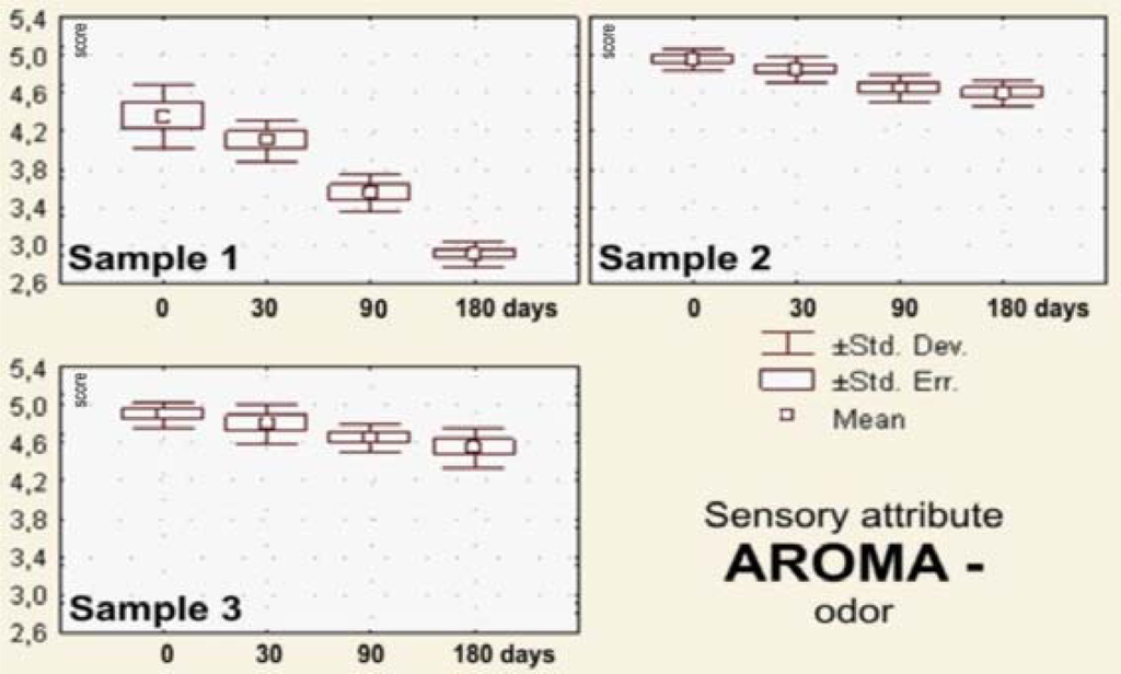 Values of the average scores for the olfactory estimated odors and orally estimated tastes of the analyzed praline samples (1, 2 and 3) are illustrated in the box-plots shown in Figures 4 and 5. Immediately after processing and after 30 days of storage of the samples filled with the blossom honey or the combination of blossom honey with pollen, odor and taste are appropriate, i.e., of excellent quality, while after 90 and 180 days they were scored with insignificantly lower average marks. However, neither the sensory parameter odor, nor the sensory property taste, were scored with the maximum marks. The explanation can possibly be found in the sweetness of pralines filled with the blossom honey (sample 2) and the appearance of mild bitterness (sample 3). Taste and flavor are the two most important characteristics of honey. The sweet taste is the result of presence of sugars, constituting about 80% of honey, but also of the presence of sour and bitter notes. Aroma is the consequence of the complex mixture of volatile components, which varies as a function of the nectar origin, conditions of production and of storage [72,73].