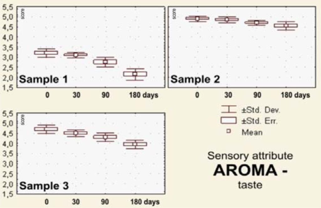 The change of the attribute of aroma—taste of the praline samples was statistically very significantly changed (p < 0.01) for the storage time longer than 30 days, but, before that period, changes of taste were not significant.