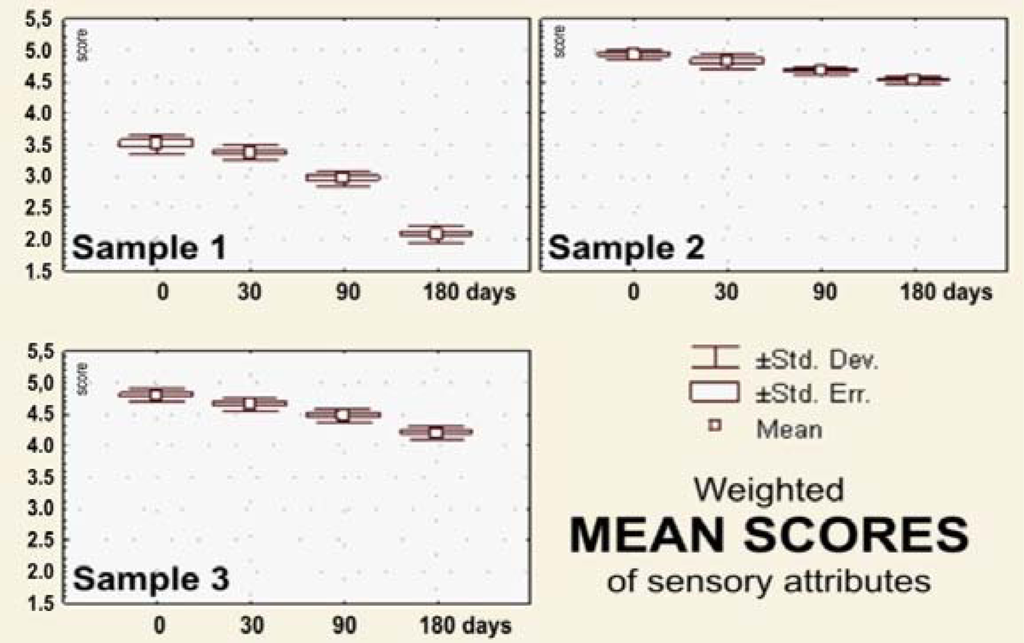 The weighted mean value of scores for pralines made from dark chocolate filled with melliferous bee drone larvae was xm = 3.51, or 70.2% compared with the maximal possible quality. After 30 days of storage, that value decreased insignificantly, being 3.37, or 67.4% of the maximum possible quality. Storage for 90 or 180 days results in substantial changes, primarily in the appearance (fat bloom on the chocolate surface, missing brilliant and smooth surfaces), strange structure and break, as well as the firmness, and pronounced toughness and adhesion to teeth, with the deviation, i.e., appearance of a nontypical flavor (xm = 2.08, or 41.6% compared with the maximal possible quality, Figure 7). This is probably accompanied by degradation or transformation of products, because the composition of raw melliferous bee drone larvae contains a significant amount of fat.
