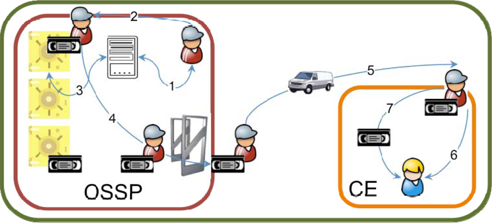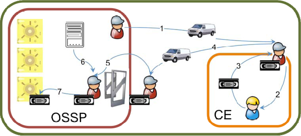 The custody unit retrieval use case is summarized in Figure 1. An employee of an off-site storage service provider (OSSP) arrives at the customer enterprise (CE) facilities (1) either because the customer has made a specific request or because of a scheduled visit specified by contract. Once in the customer enterprise facilities, the OSSP employee meets a CE employee (2) and receives from him/her a set of custody units (3). The OSSP employee then transports the custody units (4) to the OSSP facilities, where they are identified (5), classified (6) and stored (7).