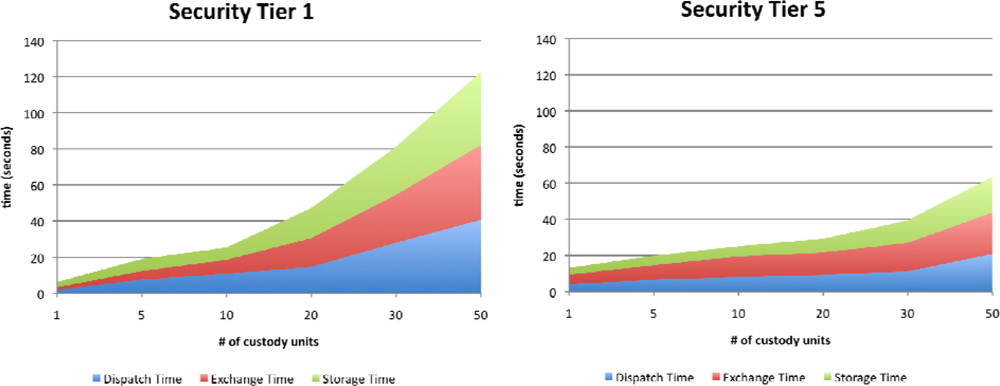 Figure 5 shows the time results for the Tier-1 and Tier-5 systems. The vertical axis shows the average dispatch, exchange and storage times obtained in the experiments, while the horizontal axis represents the number of custody units involved in the operations. It can be seen that, for operations involving only a few custody units, preparation and storage times are higher for the Tier-5 system. This is due to the overhead imposed by the custody unit scan control at every operation. However, as the number of custody units increases, simultaneous RFID scan capabilities significantly lower these times, making the repeated scan overhead time negligible compared to the time consumed by the bar code scans. A similar trend can be seen in the exchange and storage times, although the exchange times for Tier-5 systems are slightly higher than storage times due to the need to scan CE employee cards. From these results, we can conclude that the use of RFID scans significantly improves performance (and, therefore, system usability) over the use of bar codes.