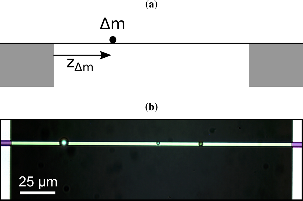 (a) Schematic side view of a string with a single particle of mass Δm positioned at zΔm. (b) Microscope top view of a silicon nitride string with 3 different particles attached. From left to right: 6 μm Polybead, 2 μm Polybead, and 2.8 μm Dynabead.