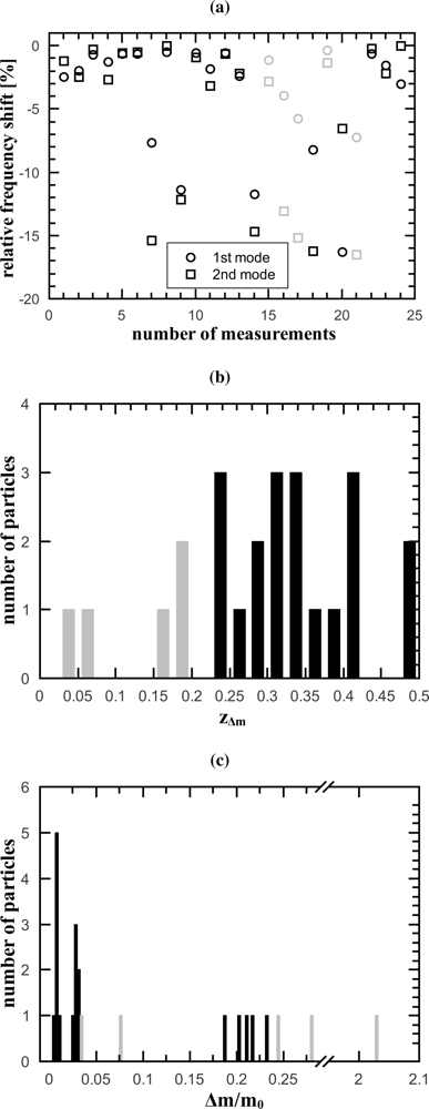(a) Measured relative frequency shifts of the first and second bending mode. Histograms of number of particles (b) versus particle positions Equation(7) for L =1and (c) versus mass ratio Equation(8) for the three different types of micro particles.