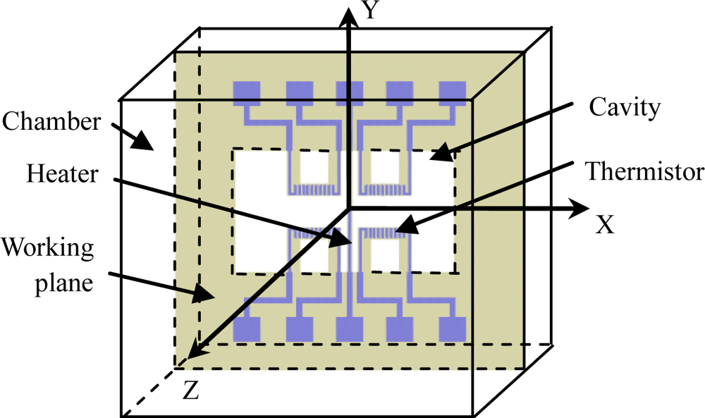 The development of micromachined inertial sensors has been widely addressed for many years. Typical inertial sensors are based on the movement of a seismic proof mass caused by an inertial quantity. These sensors utilize different sensing principles: capacitive, piezoresistive and piezoelectric measurements [1–3]. Different from these conventional devices, micromachined thermal gas inertial sensors based on heat convection, such as thermal accelerometers [4] and thermal gas gyroscopes [5], offer the advantages of simple structures, easy fabrication, high shock resistance and good reliability due to their use of a gaseous medium instead of a mechanical proof mass as the key moving and sensing elements. The working principle of these thermal inertial sensors is mainly based on the natural convection of gas in a small sealed chamber. In our previous work [5], we demonstrated a low-cost, thermo-fluidic micromachined inertial sensor, the configuration of which consisted of a small silicon etched cavity, a suspended central heater that heated up and lowered the density of the surrounding gas, and four suspended detectors symmetrically placed on two sides of the heater, all of which were assembled and packaged in a hermetic chamber. The proposed sensor could detect single-axis angular rate and dual-axis accelerations. In this paper, we only consider the angular rate detection using the sensor.
