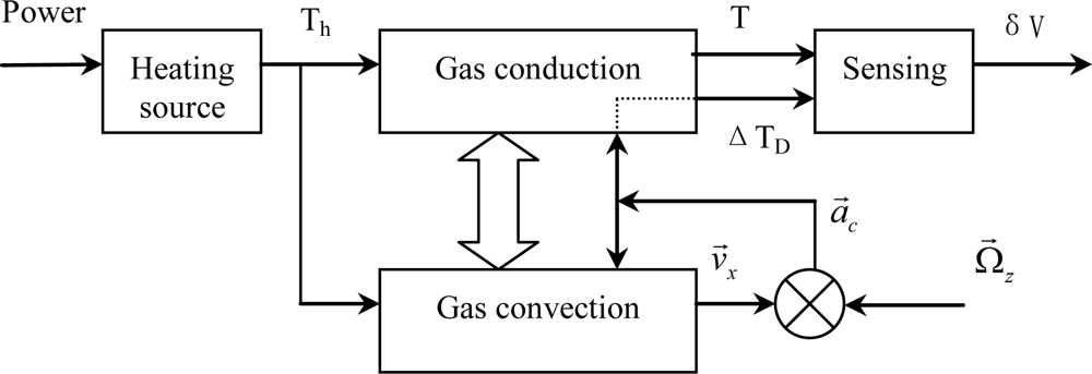 A mechanism analysis along with mathematical modeling is an essential part of the required work in the sensor design and sensor optimization processes, especially for an inertial device. An analytical model often helps to understand the behavior of a device and resolve any concurrent problems. For example, an inertial sensor generally has nonlinear problems that usually lower the sensitivity and narrow the working range of the device. In order to get rid of these problems, many researchers have taken great efforts to investigate the nonlinear mechanisms and identify the nonideal sources by modeling [6]. For a thermal gas inertial sensor, systematic modeling is inevitably important for its design and error analysis [7]. However, the modeling in a fluidic and thermal domain is more complicated than in a seismic-mass-based device due to the complexity of multi-physics coupling among electrical, thermal, fluidic, and mechanical properties. Up to now, the corresponding results of modeling in a system level for thermal gas gyroscopes have been rarely reported.
