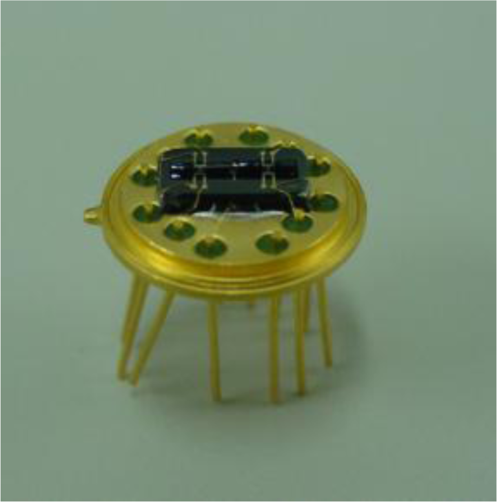 To validate the effectiveness of the model established above, we conducted experiments using a device prototype shown in Figure 5, fabricated using micromachining techniques. The detailed fabrication process has been introduced in our previous paper [5]. The sensor was heated by applying an ac power at a given frequency to the heater, and four detectors (i.e., thermistors) in a Wheatstone bridge circuit detected the flow deflection in the chamber that was correlated with the external rotation and exported an output, which was demodulated by a reference signal with the same frequency as the output.