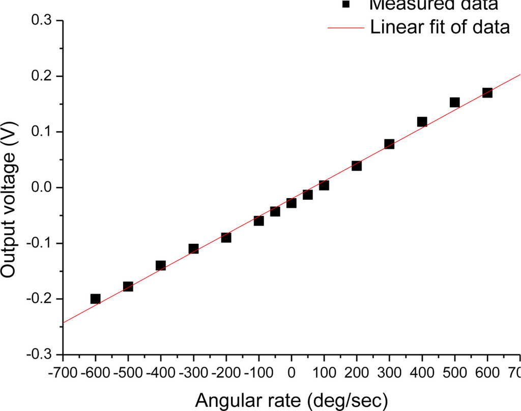 The prepared sensor (device A) was mounted on a controlled rotary table. The Z-axis of the sensor was aligned vertically so that the Earth’s gravity acceleration was applied on the Z-axis of the sensor. The angular rate ranging from −600 deg/sec up to +600 deg/sec was applied around the Z-axis of the sensor. The output voltages of the sensor under a modulation/demodulation frequency of 8 Hz (i.e., the frequency of ac power on the heater) are shown in Figure 6. A near linear relationship between the output voltage and the angular rate was exhibited. However, it is seen that the linearity for small angular rate is better than that for large angular rate, which is consistent with the theoretical analysis.