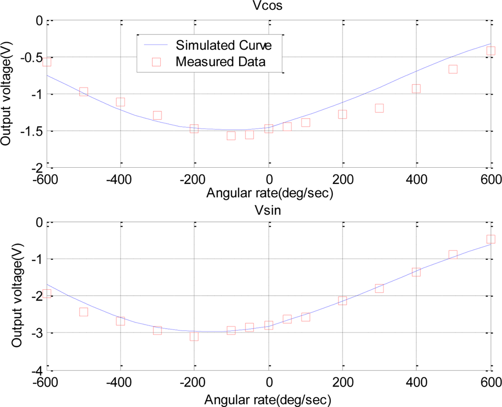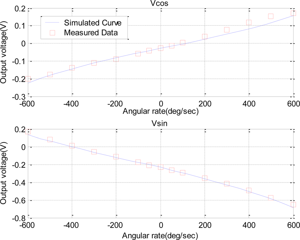 To investigate matters of nonlinearity, we further conducted a dual-phase demodulation measurement on the device and used the established model to simulate the output of the sensors. In the dual-phase measurement, two orthogonal reference signals with the same frequency and a phase difference of 90° were used to multiply the detected signal to obtain two orthogonal components of the output vector: Vcos and Vsin, respectively. According to equation (16), the theoretical formula of Vcos and Vsin are H0 ·[δ · cos(θ′−Δθ) + Ωz · cos(θ − Δθ)] and H0 · [δ · sin(θ′−Δθ) + Ωz · sin(θ − Δθ). The simulated outputs based on the theoretical model and the real measured data are compared in Figure 7, which demonstrate a good agreement between the simulated and measured results. The corresponding identification of the model parameters indicated that the equivalent damping coefficient c and the gain λ were about 12 and 0.62, respectively, the equivalent stiffness k increased gradually from 1.72 × 103 to 1.81 × 103 with the increase of the magnitude of angular rate, and an asymmetrical coefficient δ was around 350 for device A.
