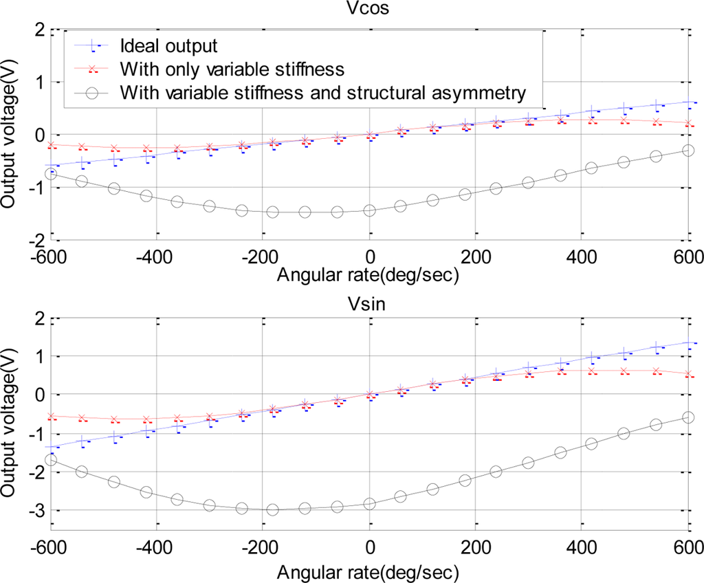 Simulation results of two orthogonal components of the output vector versus angular rates in three circumstances: ideal state, with variable stiffness, with variable stiffness and structural asymmetry.