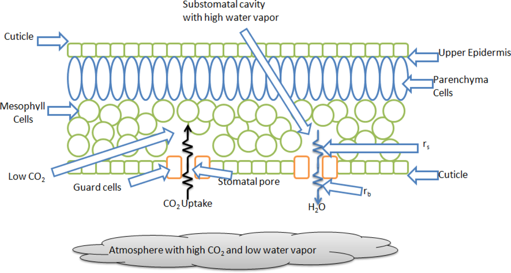 In Figure 1, a plant leaf cut scheme is shown where it can be noticed that the different plant tissues (parenchyma, mesophyll and guard cells) which have low CO2 contents and a high amount of water. The atmosphere, presented as a gray cloud constitutes a relatively dry environment that can eventually dehydrate or even kill the entire plant if the environmental conditions are not adequate [1]. The stomata guard cells which are the orange ones in Figure 1, are the plant system that controls the stomatal pores open and close process to balance the CO2 and water fluxes between the plant and its environment. Here rb is the boundary resistance and rs is the stomatal resistance.