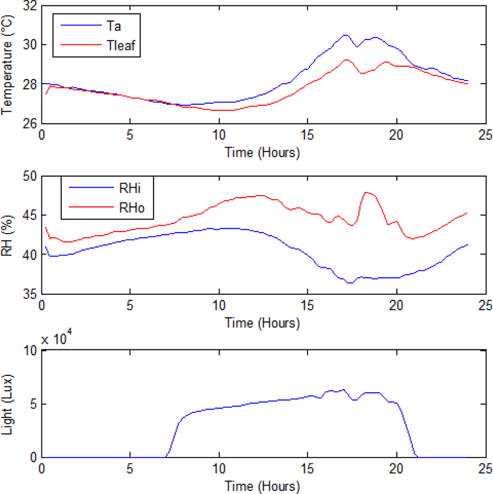 Stomatal conductance is another important transpiration dynamic variable that represents the guard cells vapor conductivity [1,2,5]. It can be estimated from primary temperature and RH sensors data. The first step is to calculate the leaf saturation vapor pressure eleaf as a function of Tleaf. For this purpose, (1) can be used to calculate eleaf substituting Ta by Tleaf to obtain (6). rb is considered a constant of 0.3 m2s/mol. Once eleaf is obtained, stomatal conductance (Cleaf) can be calculated by using (7), expressing the result in mmol/m2/s as was previously utilized [19]: