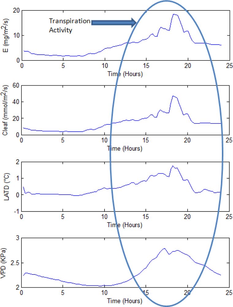 E is considered one of the most important plant physiological functions because it encompasses plants evolving and adapting to exchange moisture in a very dry atmosphere that can dehydrate or eventually kill the plant [1]. Cleaf is a transpiration variable that represents a quantitative measurement of the stomatal resistance (rs) inverse of plant guard cells plus the inverse boundary resistance (rb) against water vapor flux. Those guard cells act as flux valves to control the water vapor movement from plant to the atmosphere and CO2 movement in an inverse way [5]. LATD is the difference between air temperature (Ta) and leaf temperature (Tleaf) in relation to the global transpiration process which is proportional to E. Furthermore, VPD is also a response variable that is calculated by subtracting air vapor pressure (ei) content from saturation vapor pressure (es). These variables are very important because they can indicate drought stress conditions and condensation problems that may cause dangerous plant diseases [2,6,7].