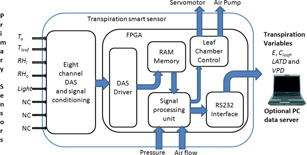 The proposed methodology for the smart sensor can be seen in Figure 2. It consists of the following stages: primary sensors, data acquisition system (DAS), FPGA-based digital signal processing (DSP), RAM memory to storage sensors measurements, RS232 data communication module, and leaf chamber mechanism control system. In the first stage, five primary sensor signals are obtained from two RTD temperature sensors, two RH capacitive sensors and one light quantum sensor. The second stage consists of an eight channel DAS capable of acquiring the signals of the five primary sensors and leaving the last three channels disconnected (NC). The signal processing stage is carried out on a FPGA-based hardware signal processing (HSP) unit, as reported by [23] for CNC and [24] for robotics vibration applications. Atmospheric pressure is provided by external smart sensor input. Volumetric air flow is fixed at a constant 0.9 lpm flow rate by using a passive flow limiter. Data communication is carried out via RS232 interface embedded in the FPGA unit to send the measurement to a data server PC or another system. Finally, the leaf chamber opening mechanism and vacuum pump is controlled by the FPGA HSP unit.