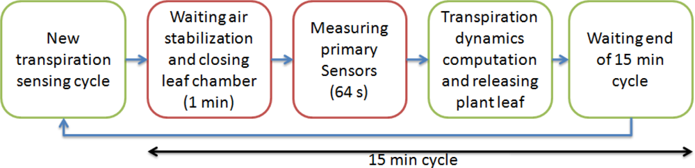 Transpiration smart sensing cycle methodology is shown in Figure 3. Here, the green blocks represent the open leaf chamber stages and red blocks represent the closed leaf chamber; therefore, isolating the plant leaf. Each measurement starts with the activation of the air vacuum pump and closing the leaf chamber by the servomotor controller to isolate the plant sample. The smart sensor performs a 1 min delay to wait pneumatic line flow steady state. After that, the data acquisition starts by measuring cycles of 1 Hz sampling frequency from the five primary sensors. This process is repeated to acquire 64 samples from each sensor in each transpiration measurement cycle. Once sufficient data has been acquired, the computation of transpiration dynamics are performed, data can be transferred, the leaf chamber is opened and vacuum pump is turned off to save energy. Finally, another delay is carried out to complete the 15 min duration of the entire transpiration smart sensing process. This measurement period was selected because in commercial equipment, the fastest acquisition period is 15 min and this is necessary to establish the same sampling frequency to compare both sensing techniques.