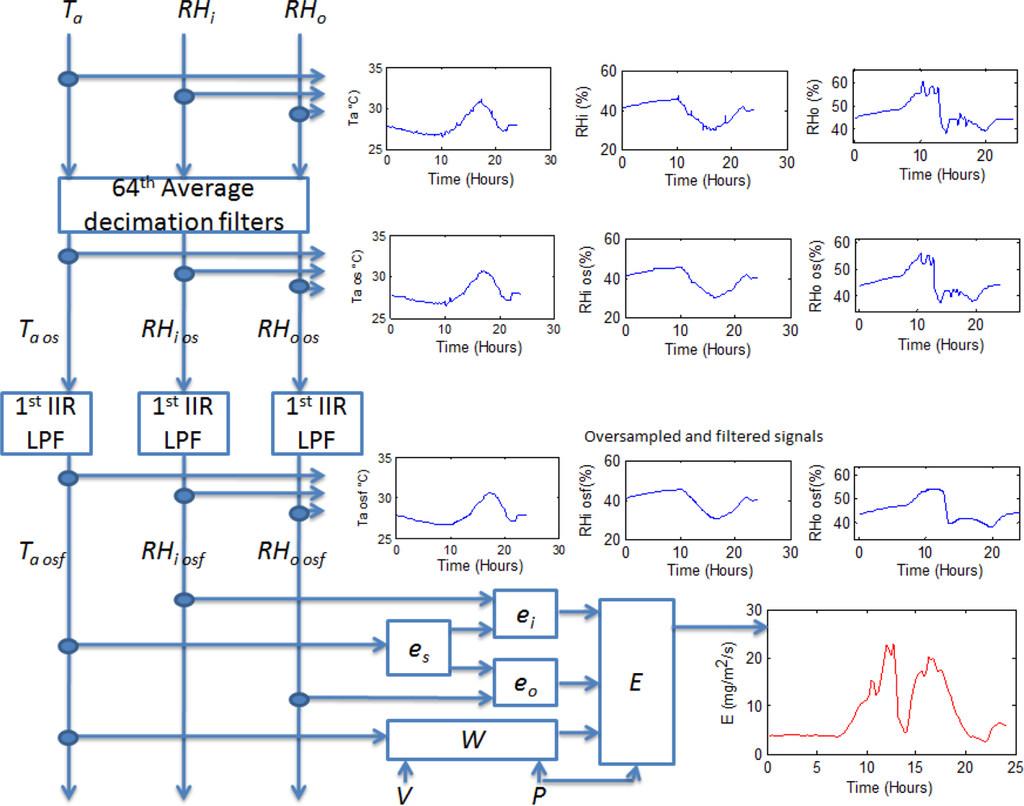 In order to calculate plant transpiration E, an FPGA-based signal processing methodology is proposed and described in Figure 4. Average decimation filters of 64th order are applied to all the primary sensors signals Ta, RHi, and RHo in order to reduce undesired quantization noise as stated in (9), (10), and (11) and presented by [14]. Once Ta os, RHi os, and RHo os were estimated, a 1st order IIR low-pass filter (LPF) with cut-off frequency (fc) of 1/3600 Hz is applied to obtain the filtered versions of the decimated signals known as Ta osf, RHi osf, and RHo osf. To gather E, equations (1) to (5) are computed from the filtered signals as presented in Figure 4.