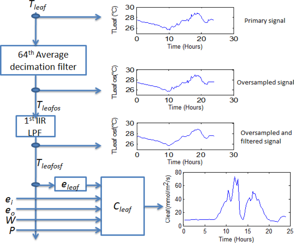Average decimation filters of 64th order are applied to Tleaf sensor signals to reduce undesired quantization noise in the same manner as the previous stage according to (12). Once Tleaf os was estimated, a 1st order IIR low-pass filter (LPF) stage with fc = 1/3600 Hz is applied to obtain its filtered version Tleaf osf. Consequently, eleaf is calculated as stated in (6) and introduced in (7) to obtain Cleaf :
